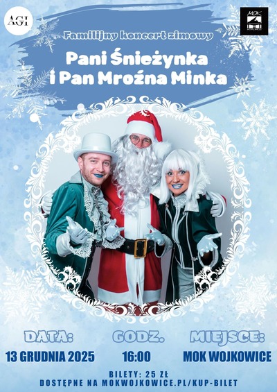 13 grudnia o godzinie 16:00 zapraszamy do Miejskiego Ośrodka Kultury na wyjątkowy, familijny koncert zimowy „Pani Śnieżynka i Pan Mroźna Minka” – pełen muzyki, magii i świątecznej atmosfery.