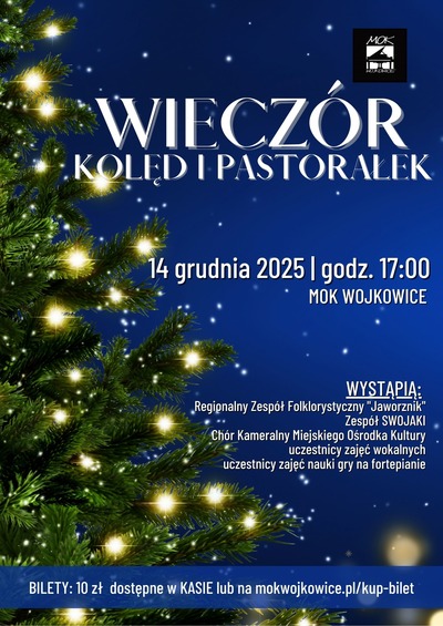 Przygotowaliśmy dla Was specjalny program z najpiękniejszymi polskimi kolędami i pastorałkami. Każdy uczestnik wydarzenia będzie mógł dołączyć do wspólnego kolędowania i w radosnej, magicznej atmosferze poczuć nadchodzące Boże Narodzenie. Koncert rozpocznie się o godzinie 17.00. Wstęp – 10 zł. Do wspólnego kolędowania oraz wysłuchania koncertu zapraszają: Regionalny Zespół Folklorystyczny „Jaworznik”, Kameralny Chór Wielopokoleniowy, Zespół „Swojaki”, uczestnicy zajęć nauki gry na fortepianie oraz warsztatów wokalnych. Kolędy od wieków tworzą wyjątkową atmosferę Bożego Narodzenia – to one nadają Świętom ciepło, budzą wzruszenia i przywołują najpiękniejsze wspomnienia wspólnego rodzinnego śpiewania. To tradycja, która jednoczy pokolenia i pozwala na chwilę zatrzymać się w codziennym pędzie. Dlatego właśnie zapraszamy do MOK-u na Kolędowy Koncert – to doskonała okazja, by zanurzyć się w świątecznym klimacie i posłuchać wyjątkowego repertuaru.